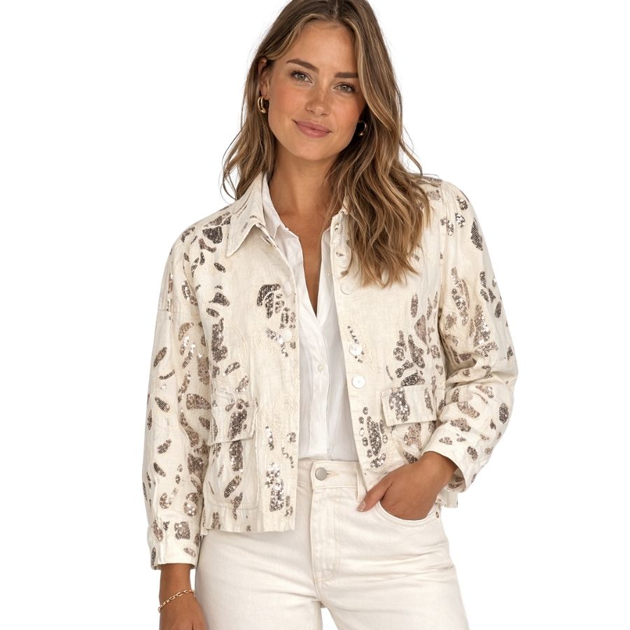 Elegant jakke fra Smashed Lemon i lys nuance med smukke pailletdetaljer – perfekt til både hverdag og festlige anledninger.