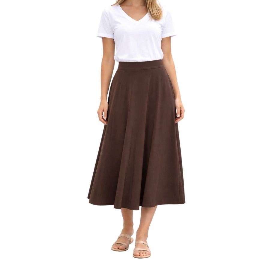 Denne Soulmate nederdel har en klassisk og stilren silhuet med let vidde, der giver et smukt fald og god bevægelsesfrihed. Den bløde bomuldskvalitet med en smule elastan sikrer en behagelig pasform, som gør den ideel til både hverdag og pænere anledninger. Den varme brune farve giver et elegant udtryk og er nem at kombinere med både lyse og mørke overdele.