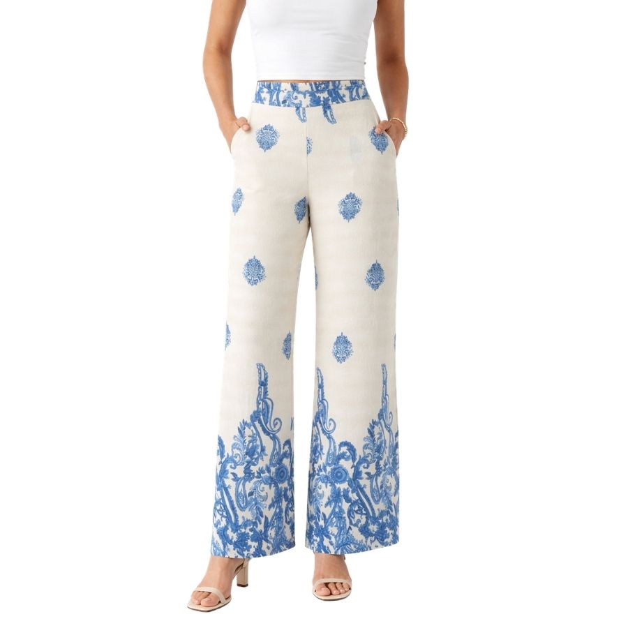 Let og elegant buks med smukt blåt print – perfekt til sommerens feminine outfits.