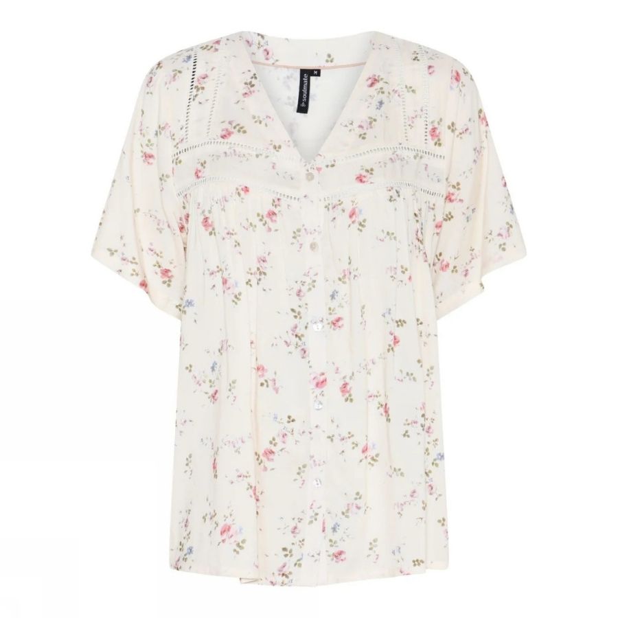 Denne smukke Annis bluse fra Soulmate emmer af feminin lethed og romantisk stil. Den lyse bund kombineret med det fine blomsterprint i sarte nuancer giver et blødt og elegant udtryk, som passer perfekt til både hverdag og pænere anledninger.