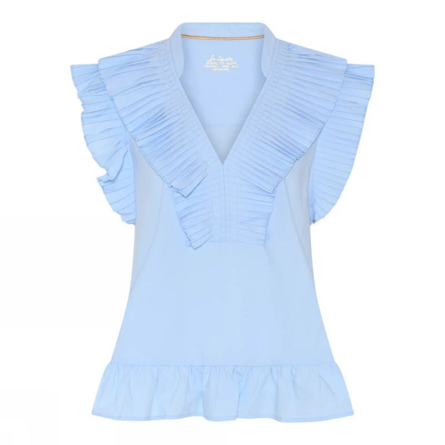 Smuk lyseblå top med fine flæser og let sommerlig elegance 💙