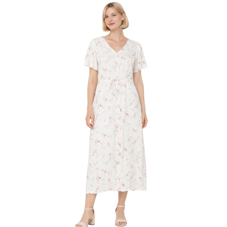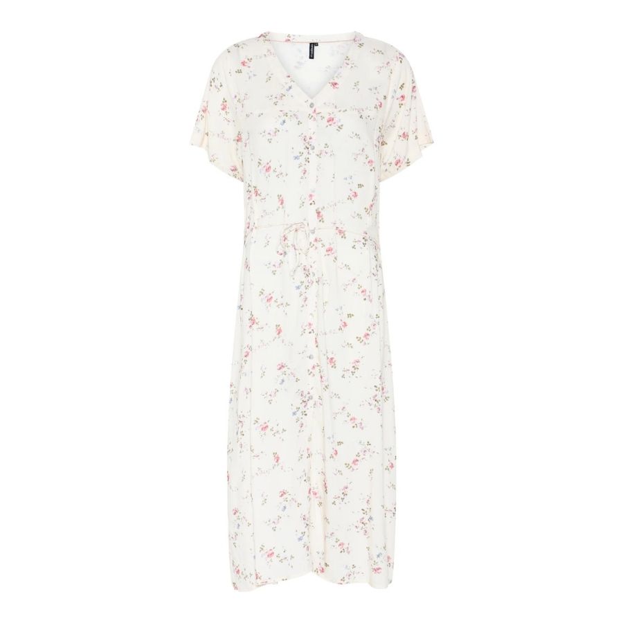 Denne smukke kjole fra Soulmate er indbegrebet af sommer og lethed. Den er lavet i 100% viskose, som falder blødt og behageligt omkring kroppen. Det fine blomsterprint giver et romantisk og feminint udtryk, mens V-udskæringen og bindebåndet i taljen fremhæver figuren på en elegant måde. Kjolen har en afslappet pasform og korte ærmer, hvilket gør den ideel til både hverdag og hyggelige sommeranledninger.