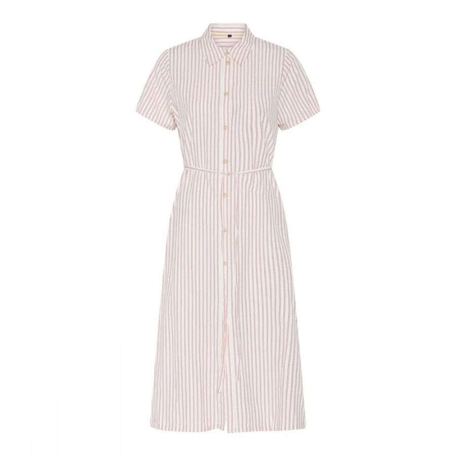 Denne elegante skjortekjole fra Soulmate kombinerer et klassisk design med et friskt, sommerligt udtryk. De fine lodrette striber giver et flot og slankt look, mens den gennemknappede front og kraven tilfører et tidløst touch. Kjolen har korte ærmer og et bindebånd i taljen, som gør det nemt at fremhæve figuren. Den lette kvalitet i bomuld og polyester gør den både behagelig at have på og nem at holde pæn – perfekt til både hverdag og sommerens arrangementer.