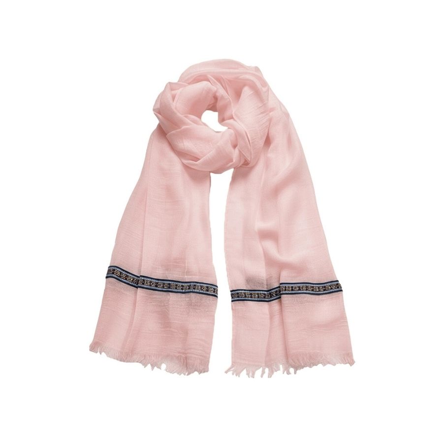 Dette elegante tørklæde fra Fox By Ren er et smukt og alsidigt accessory, der tilfører dit outfit et feminint og roligt udtryk. Den bløde rosa farve kombineret med den dekorative kant giver et stilrent look med et lille twist.