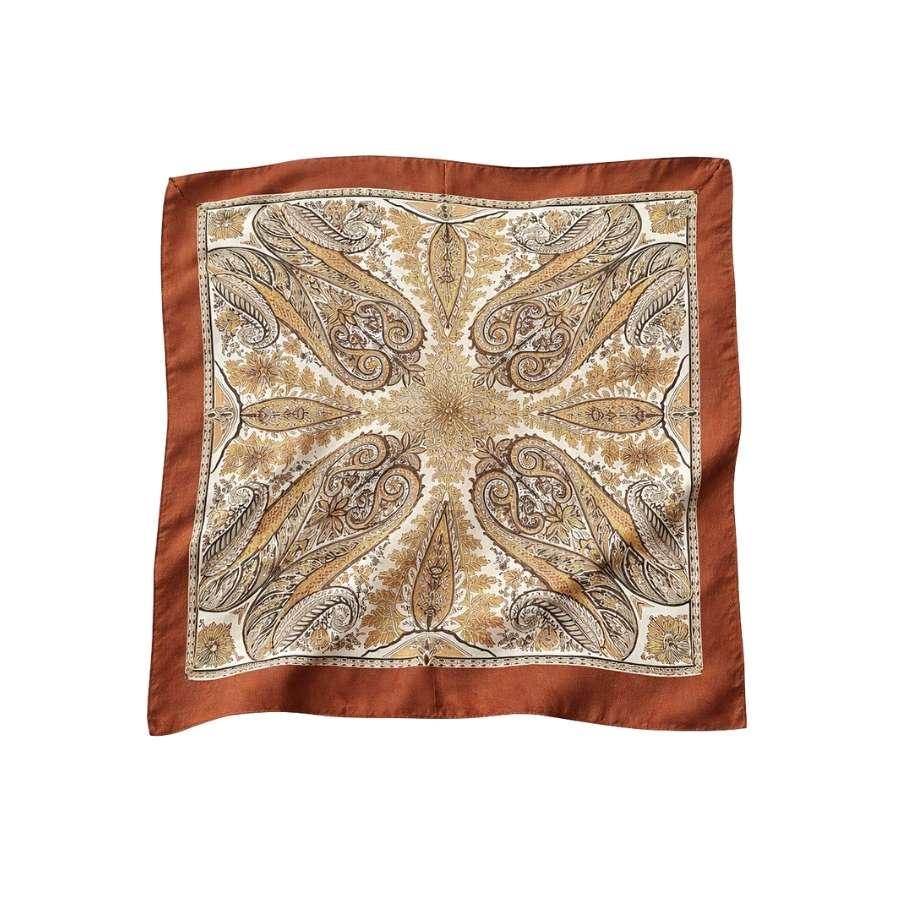 Dette smukke tørklæde fra LINETA er et klassisk og elegant accessory med et detaljerigt paisleyprint. Farverne i varme nuancer af cognac, brun og beige giver tørklædet et eksklusivt og tidløst udtryk, som passer perfekt til både efterår og vinter – men også kan bruges året rundt. Tørklædet har et mere struktureret look end de lette tørklæder og fungerer både som pynt om halsen, i håret eller bundet på tasken. Det fine mønster og den markerede kant giver et gennemført og sofistikeret udtryk.