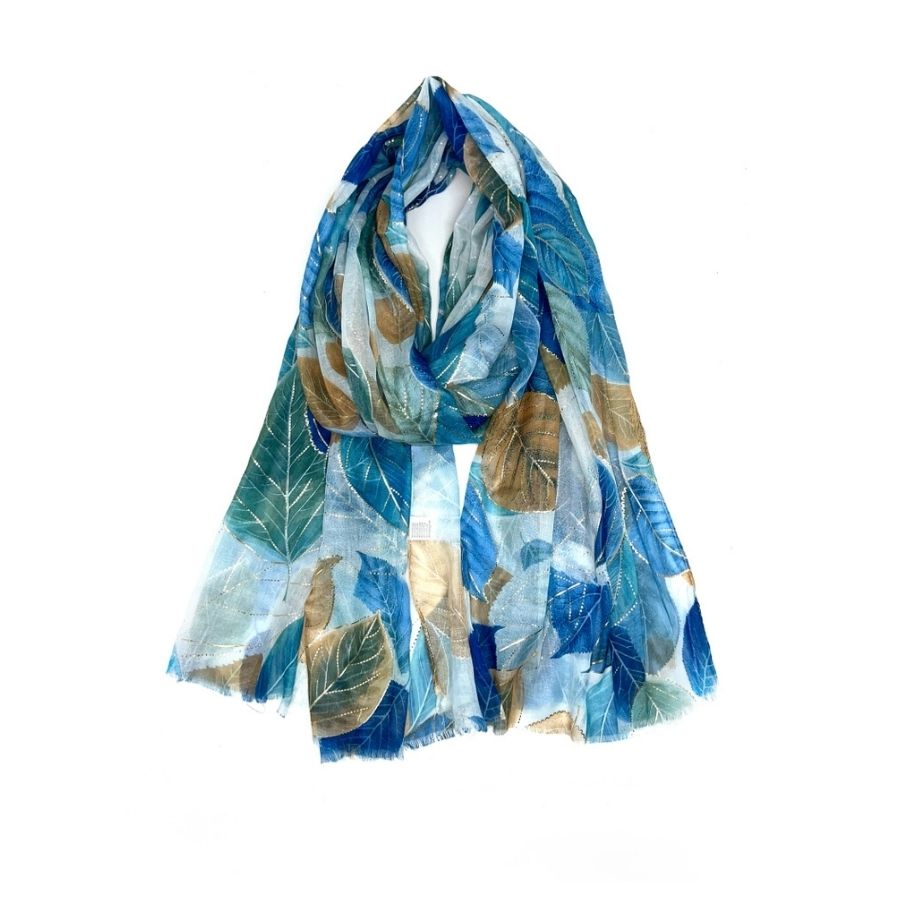 Let og elegant tørklæde med smukt bladmønster i blå og sandfarvede nuancer. Giver et friskt og feminint udtryk.