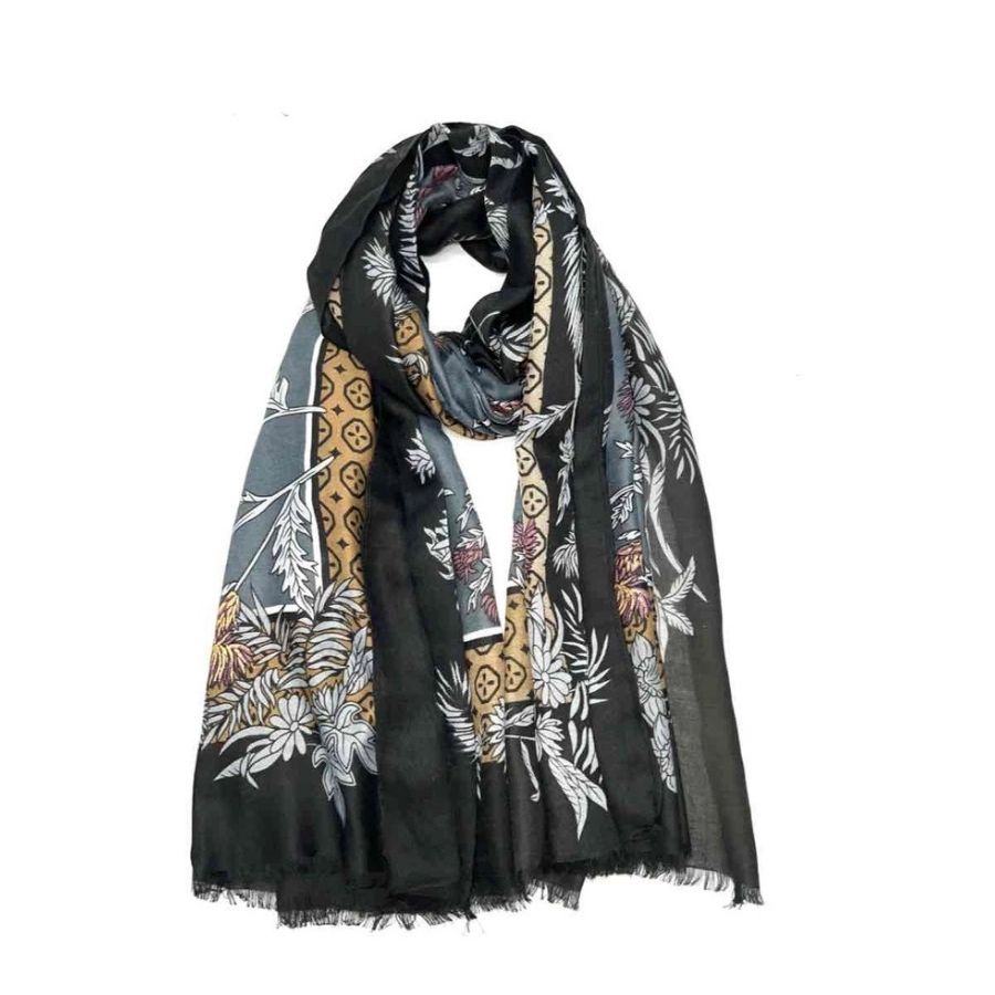 Elegant og blødt tørklæde i viskose og bomuld med dekorativt mønster i sort, grå og varme detaljer. Et stilfuldt valg til enhver garderobe.