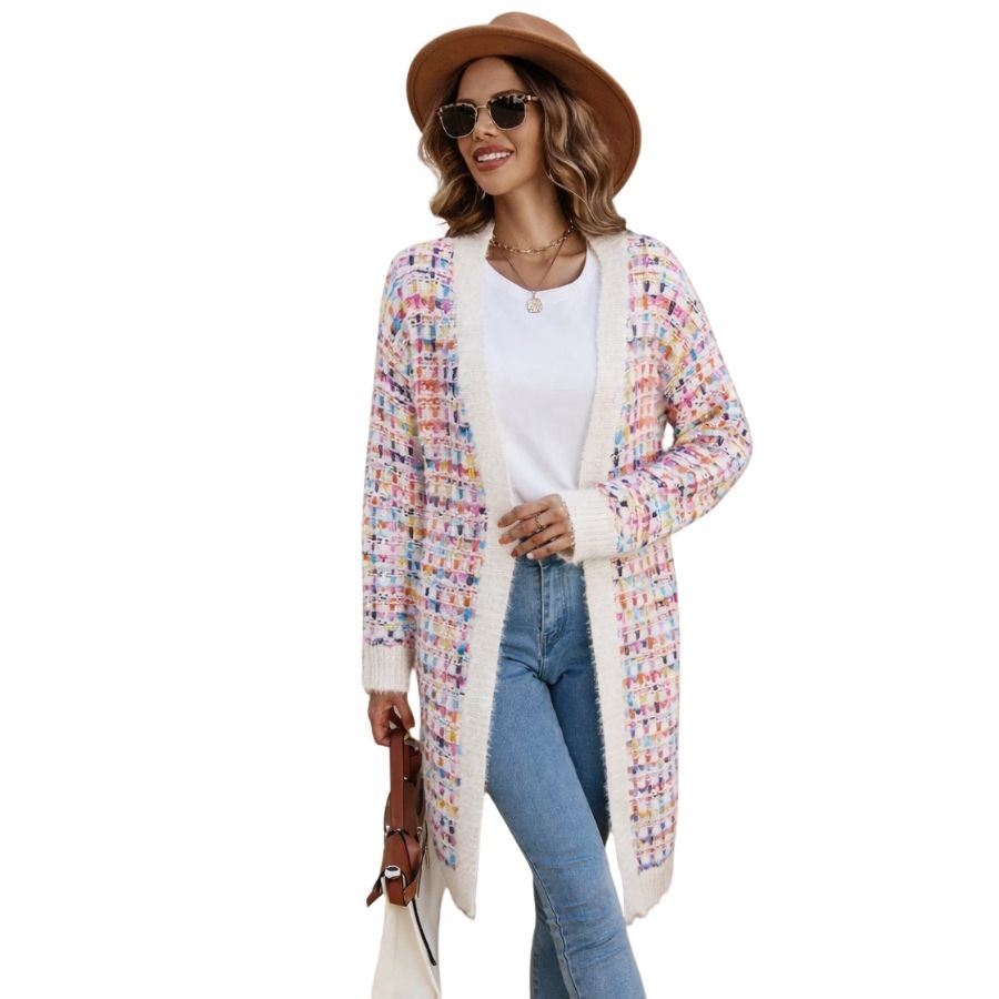 Blød og farverig cardigan i one size – perfekt som let lag over hverdagslooket.