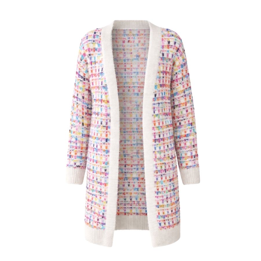 Denne cardigan fra FS Collection er en skøn kombination af komfort og farverigt design. Det vævede, multifarvede mønster giver et levende og feminint udtryk, mens den åbne front og de lange ærmer gør den nem at style over både toppe og bluser. Cardiganen er strikket i en blød akrylkvalitet, som er behagelig at have på og ideel som overgangsstrik eller til kølige dage indendørs.