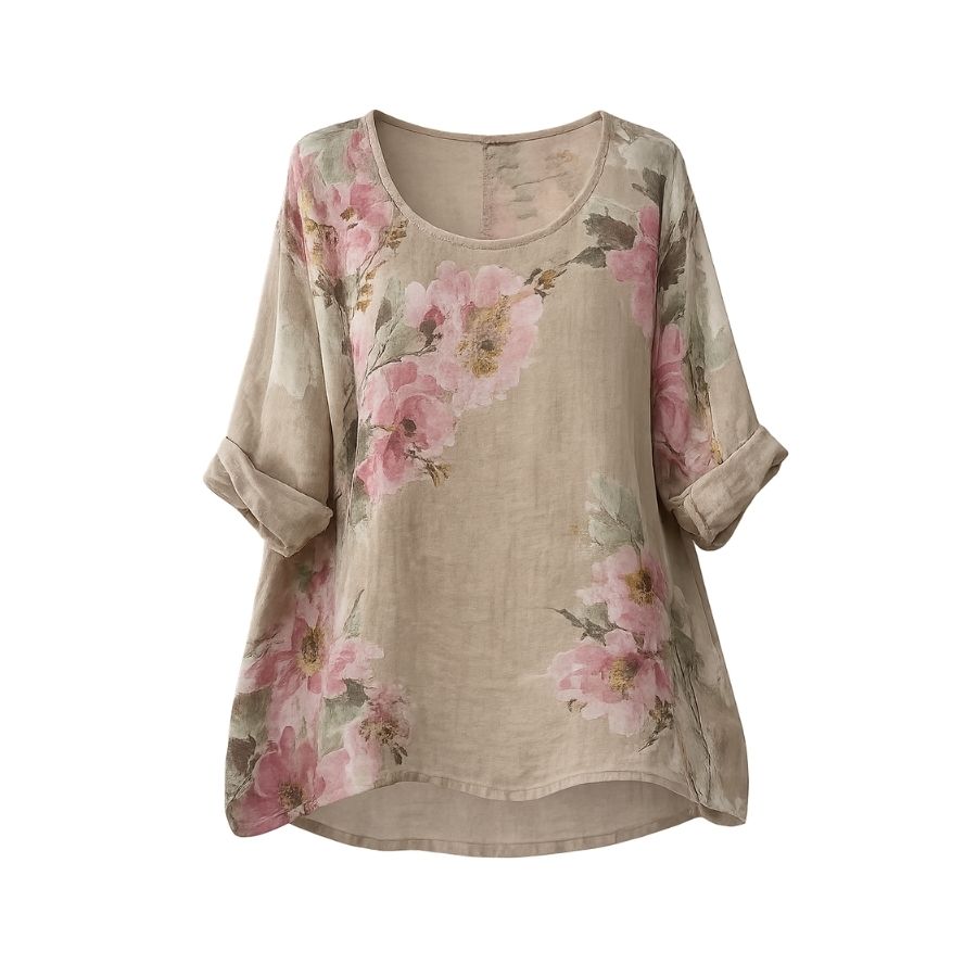 Løs hørbluse i taupe med blomsterprint – let, elegant og perfekt til sommer.