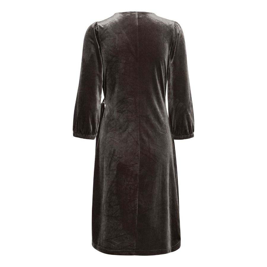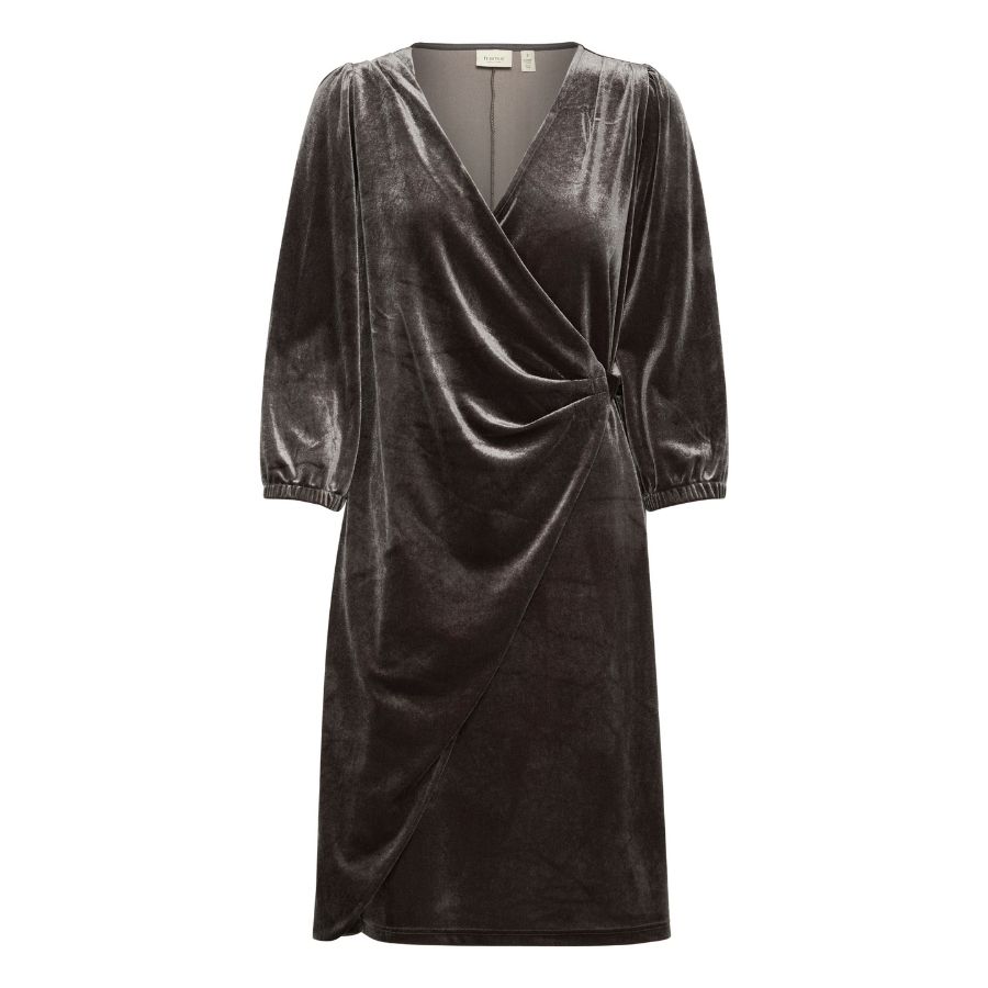 Denne smukke velourkjole fra Fransa er det perfekte valg til efterårets og vinterens fester. Kjolen har en elegant slå-om effekt, som både giver en flatterende pasform og et feminint udtryk. Det bløde velour stof falder smukt om kroppen og føles behageligt at have på hele dagen eller aftenen. De let puffede ærmer med elastik ved håndleddet giver et moderne touch, mens den diskrete drapering i siden skaber et flot, eksklusivt look. Brug den med et par fine støvler eller høje hæle, og du er klar til alt fra julefrokoster til hyggelige sammenkomster. En stilren favorit til garderoben.