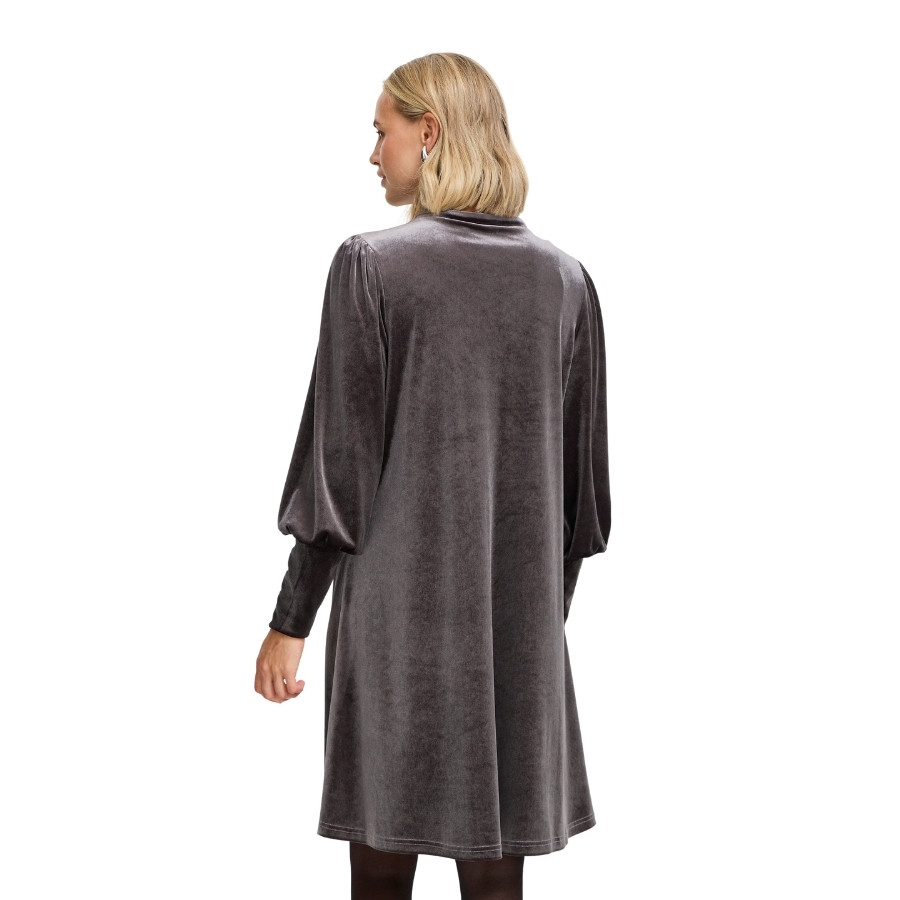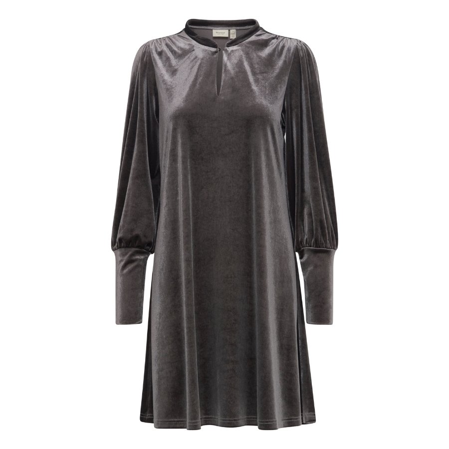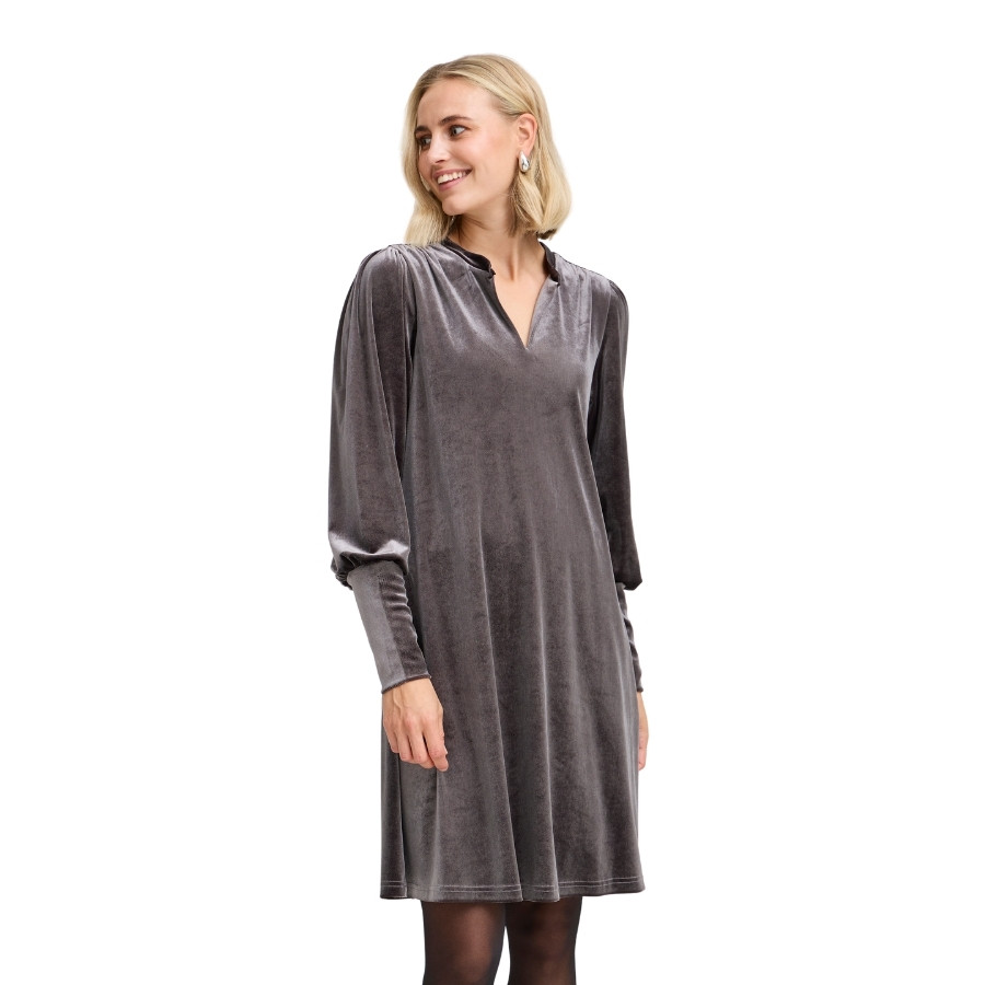 Denne elegante grå velourkjole fra Fransa er et stilfuldt valg til både hverdag og festlige lejligheder. Kjolen er designet i et blødt og glansfuldt velourmateriale, som giver et luksuriøst udtryk og en behagelig fornemmelse mod huden. Den fine halsudskæring med lille slids tilfører et feminint touch, mens de lange, let puffede ærmer skaber smuk fylde og et moderne look. Pasformen er løs og komfortabel, så kjolen falder flot og giver god bevægelsesfrihed. Style den med støvler eller stilletter alt efter anledning – uanset hvad får du en kjole, der både er nem at bære og smuk at se på.