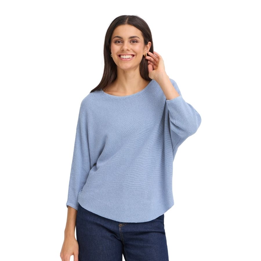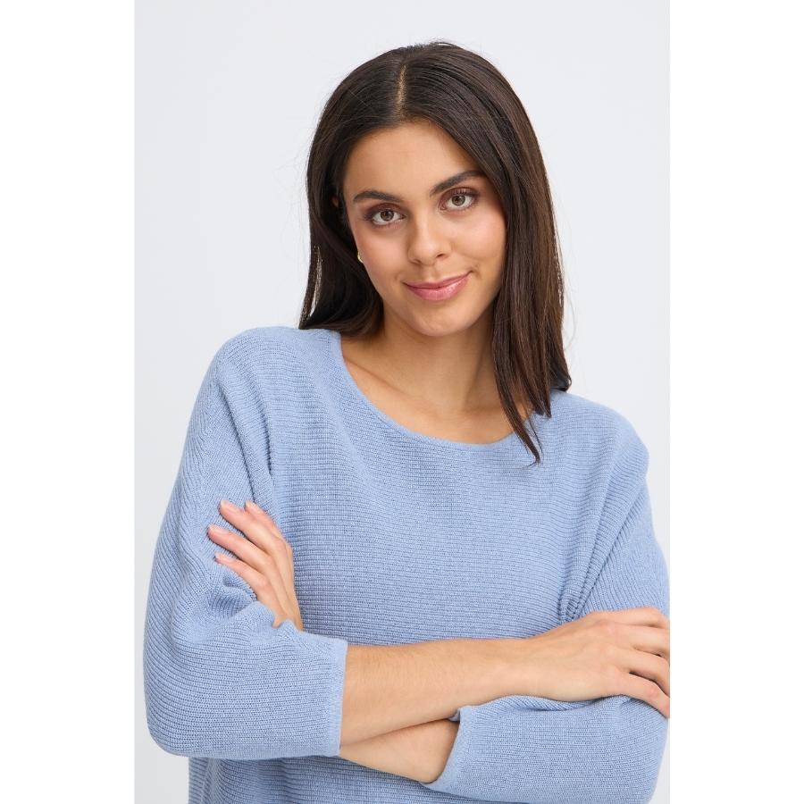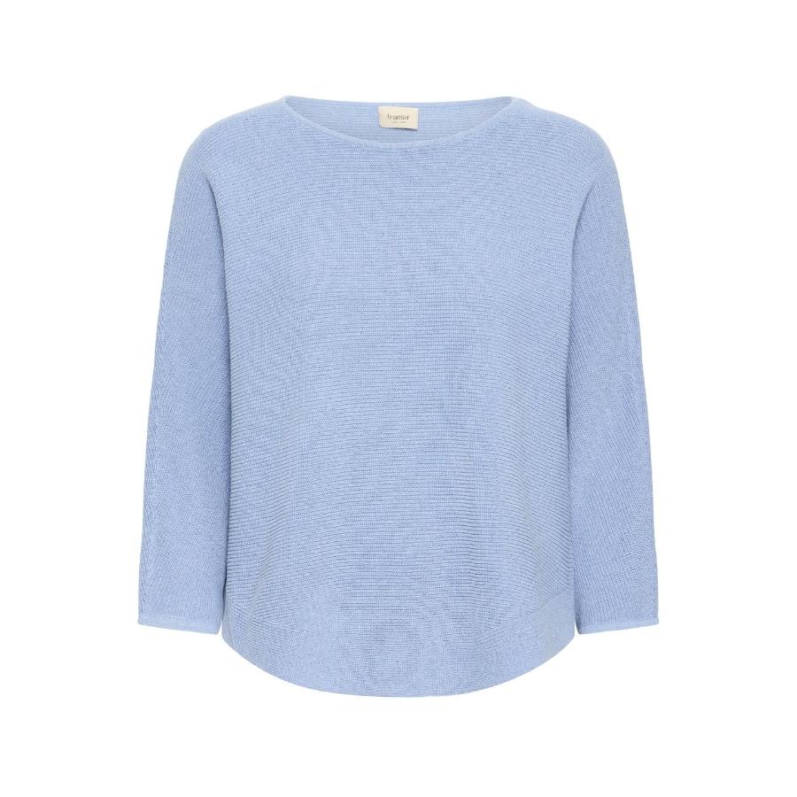 Denne smukke lyseblå strikbluse fra Fransa er et skønt og komfortabelt valg til både hverdag og afslappede dage. Blusen er lavet i en blød og let strikkvalitet, som føles behagelig mod huden og falder flot på kroppen. Den har et enkelt og klassisk design med rund hals, trekvartlange ærmer og en let buet bund, der giver et feminint og moderne udtryk. En alsidig strik, der passer perfekt til jeans, pæne bukser eller en nederdel – og som nemt kan styles til både forår, sommer og overgangsperioder.