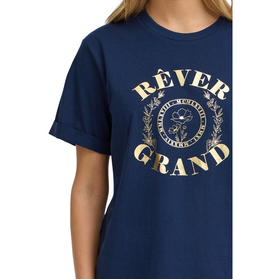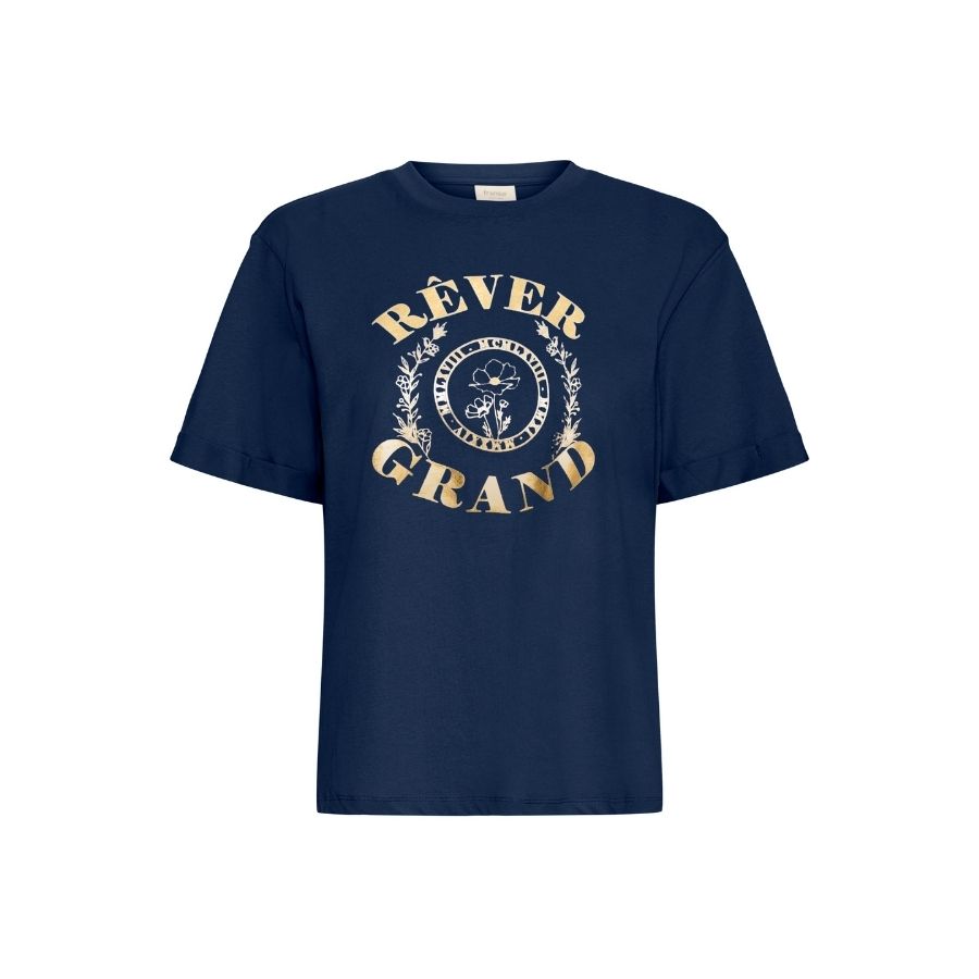 Fransa Frpalmer er en smuk og moderne T-shirt, der kombinerer et klassisk marineblåt udtryk med et elegant guldfarvet frontprint. Den bløde bomuldsblanding gør T-shirten behagelig at have på hele dagen, og den let oversize pasform giver et casual, men stadig feminint look. Printet “RÊVER GRAND” og blomsteremblemet tilfører et trendy, fransk-inspireret touch, som gør T-shirten ideel til både jeans, nederdele og shorts. Perfekt til hverdagsbrug, men nem at style op til et mere pænt outfit med en blazer eller cardigan. En stilfuld og anvendelig nyhed fra Fransa.