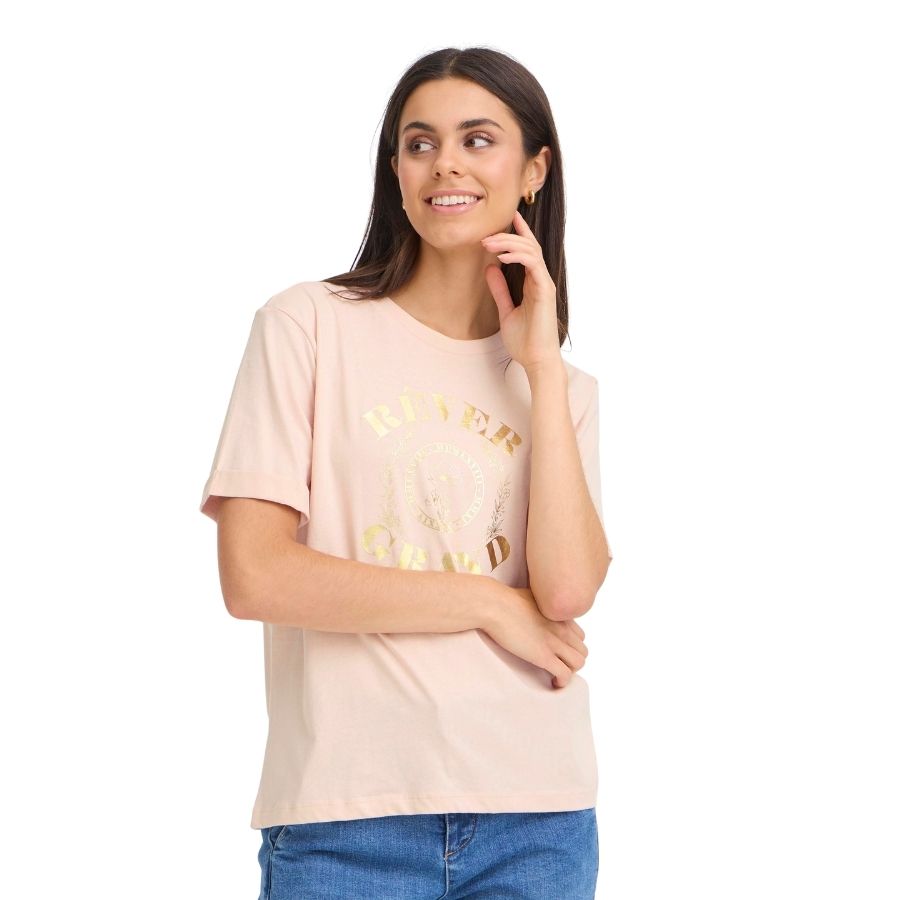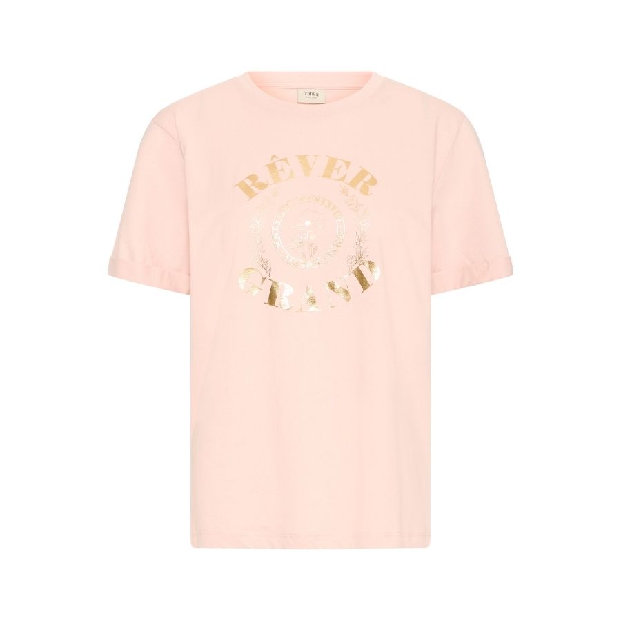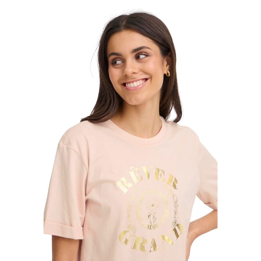 Fransa Frpalmer er en feminin og moderne T-shirt, der kombinerer en smuk lyserød base med et elegant guldfarvet frontprint. Den bløde bomuldskvalitet giver en behagelig følelse mod huden, og den let afslappede pasform gør den ideel til både hverdag og afslappede weekendlooks. Det franske statement “RÊVER GRAND” og blomsteremblemet giver et trendy og eksklusivt udtryk, som gør T-shirten utrolig nem at style. Brug den med jeans, nederdel eller shorts – eller under en blazer for et pænt hverdagslook. En skøn og iøjnefaldende nyhed fra Fransa.