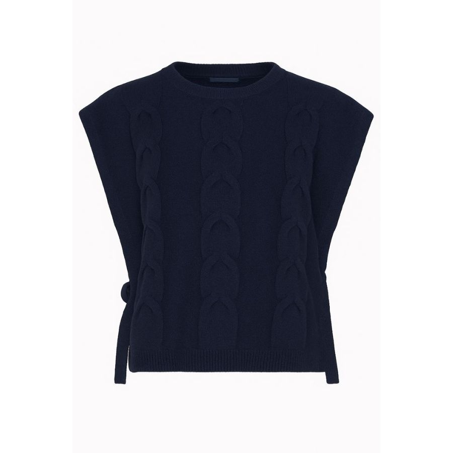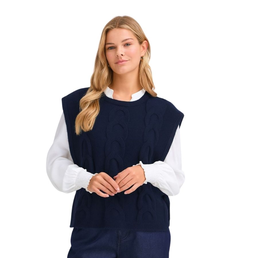 Denne flotte strikvest fra Fransa er et perfekt valg til dig, der ønsker et moderne og lag-på-lag venligt look. Vesten er strikket i en blød kvalitet med et smukt, kabelstrikket mønster foran, som giver et feminint og eksklusivt udtryk. Farven navyblå gør den utrolig nem at style – brug den over en skjorte, bluse eller kjole for et stilfuldt og tidløst outfit. Pasformen er let boxy og behagelig, så du får et afslappet, men velklædt look hele dagen. En skøn basisstyle, som passer til både hverdagsbrug og mere pæne anledninger.