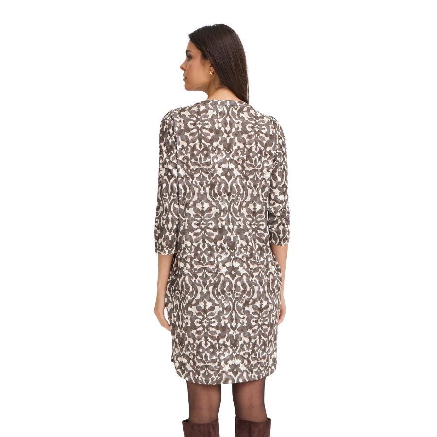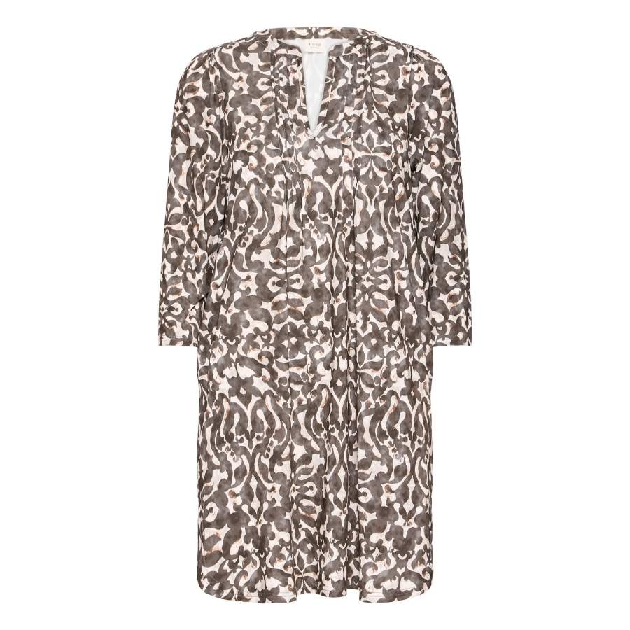 Denne elegante Tunika fra Fransa er designet i smukke naturtoner med et dekorativt mønster, som giver et feminint og tidløst udtryk. Tunikaen har en flatterende V-udskæring og let rynk ved brystet, som skaber en behagelig pasform. De ¾-lange ærmer gør kjolen velegnet til både hverdag og pænere brug. Style den med strømpebukser og støvler i de køligere måneder eller med sandaler til forår og sommer. En alsidig kjole, der nemt kan bruges sæson efter sæson.