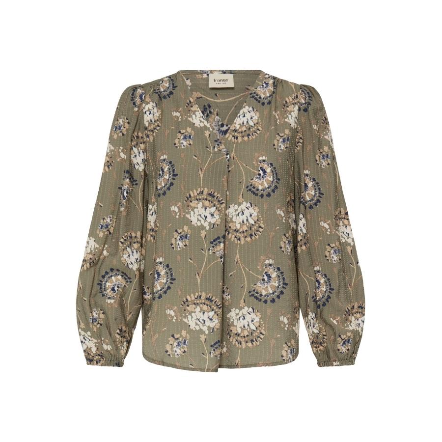 Fransa Frkalia er en feminin og elegant bluse i en smuk olivengrøn bundfarve med dekorativt blomsterprint i blå, creme og varme naturtoner. Blusen har en flatterende V-udskæring og lange ærmer med let volumen, der afsluttes med elastik ved håndleddene. Den lette kvalitet giver et flot fald og høj komfort, hvilket gør blusen ideel til både hverdag og pænere brug. Style Frkalia med jeans for et afslappet look eller med bukser og cardigan eller blazer til job.