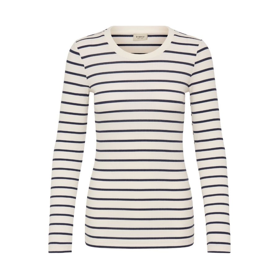 Fransa Frhizamond er en klassisk og tidløs bluse med fine navy striber på en lys offwhite bund. Blusen har rund halsudskæring og lange ærmer, som giver et enkelt og anvendeligt look. Den bløde, strækbare kvalitet sikrer høj komfort og gør blusen ideel til både hverdag og fritid. Brug Frhizamond med jeans for et afslappet udtryk eller style den under en cardigan eller blazer til et mere sammensat outfit.