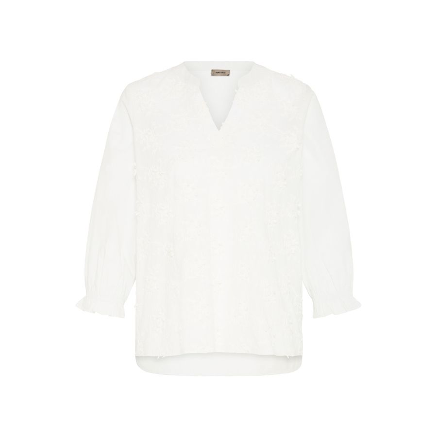 Fransa Frobbie er en elegant og feminin bluse i en klassisk hvid nuance med diskret struktur i stoffet. Blusen har en flatterende V-udskæring og ¾-lange ærmer, der afsluttes med let vidde og en blød kant. Den løse pasform og lette kvalitet gør blusen behagelig at have på hele dagen og nem at style. Brug Frobbie til både hverdag med jeans eller til pænere brug sammen med bukser eller nederdel.