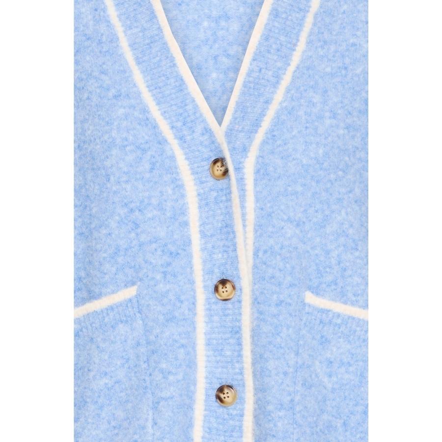 Blød og let cardigan i smuk lyseblå nuance med fine kontrastkanter og klassisk knaplukning.