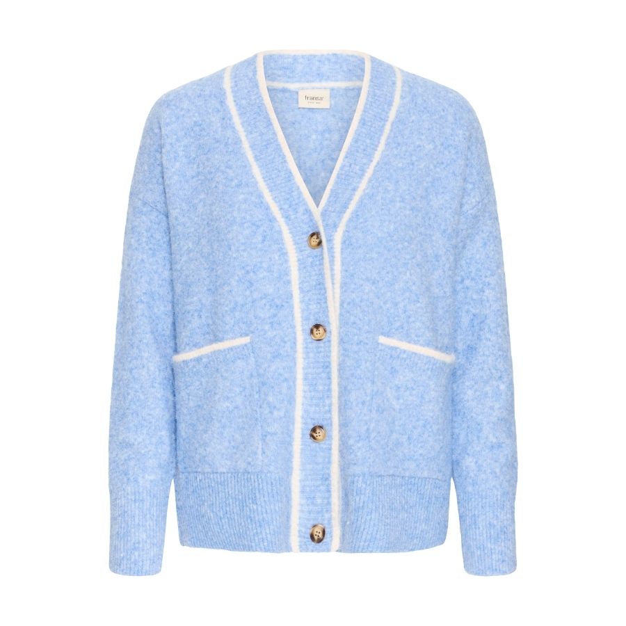 FRKENDRA cardiganen fra Fransa er en skøn og anvendelig strik, der kombinerer komfort med et feminint udtryk. Den er strikket i en blød og let kvalitet, som føles behagelig mod huden og er nem at bruge både inde og ude. Den lyseblå farve giver et friskt og roligt look, mens de lyse kontrastkanter langs v-hals, knaplukning og lommer tilfører et elegant touch. Cardiganen har en klassisk pasform med lange ærmer og ribkanter, som sikrer en flot afslutning. Perfekt som let overtøj eller som ekstra lag over bluser og kjoler.