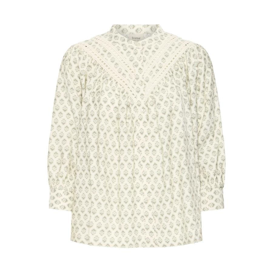 Denne elegante bluse fra Fransa har et romantisk udtryk med sit småblomstrede print og fine blonder i V-form over brystet. Den har rund hals med lille stolpelukning og knapper foran samt let rynk ved skuldre og bærestykke, som giver en blød og behagelig pasform. Den lette viskosekvalitet gør blusen luftig og behagelig at have på – perfekt både til hverdag og pænere brug.