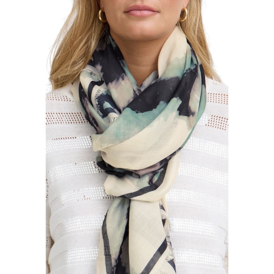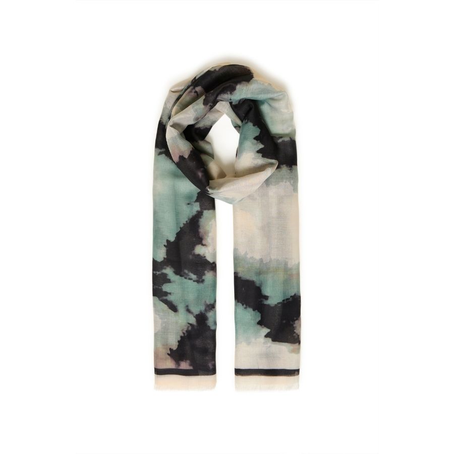 Let og elegant tørklæde fra Fransa med smukt, kunstnerisk print i bløde grønne, sandfarvede og mørke nuancer.