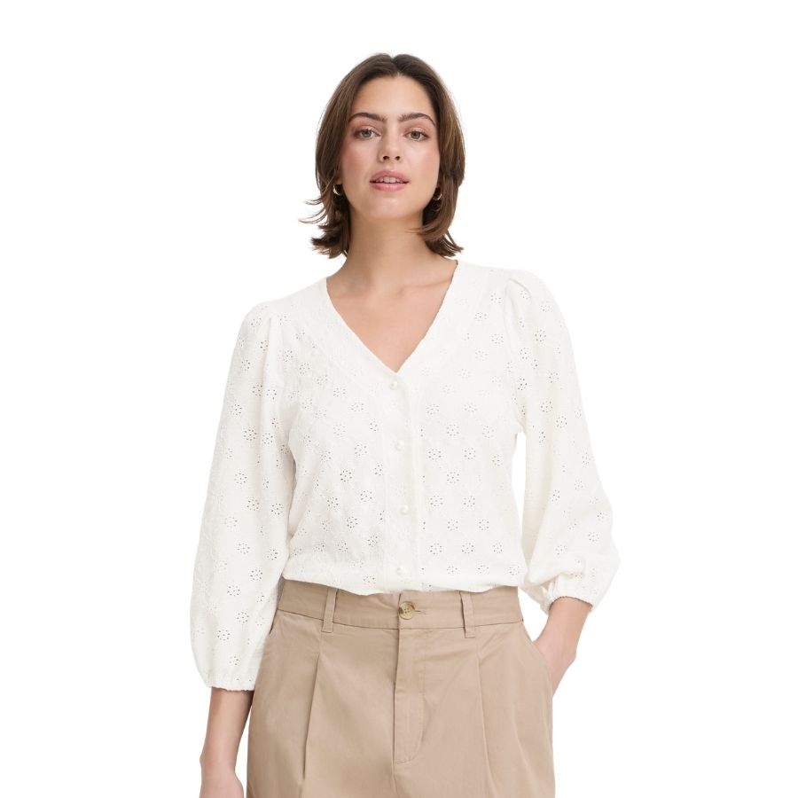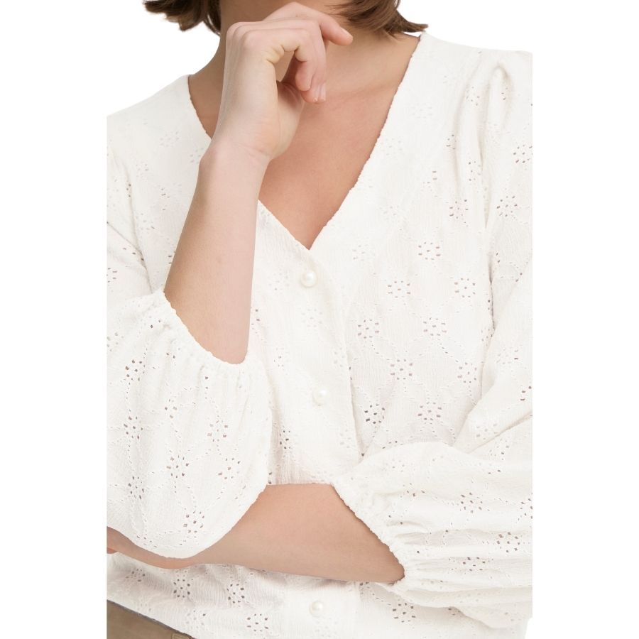 Denne smukke top fra Fransa har et fint og diskret hulmønster, der giver et let og feminint udtryk. Den er designet med V-udskæring og knaplukning foran samt lange ærmer med let volumen og elastik ved håndleddene. Den bløde kvalitet falder flot og gør toppen behagelig at have på hele dagen.