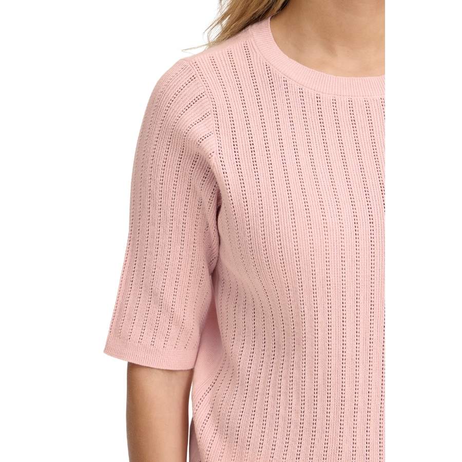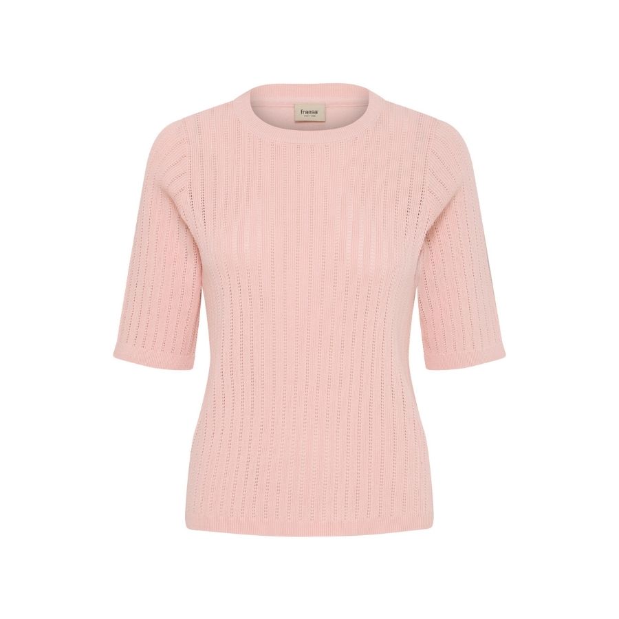 Denne fine pullover fra Fransa er strikket i en blød og åndbar bomuldskvalitet med et smukt, lodret hulmønster, der giver et feminint og let udtryk. Den har rund hals og korte ærmer, som gør den ideel til de lunere måneder eller som lag under en blazer eller cardigan.
