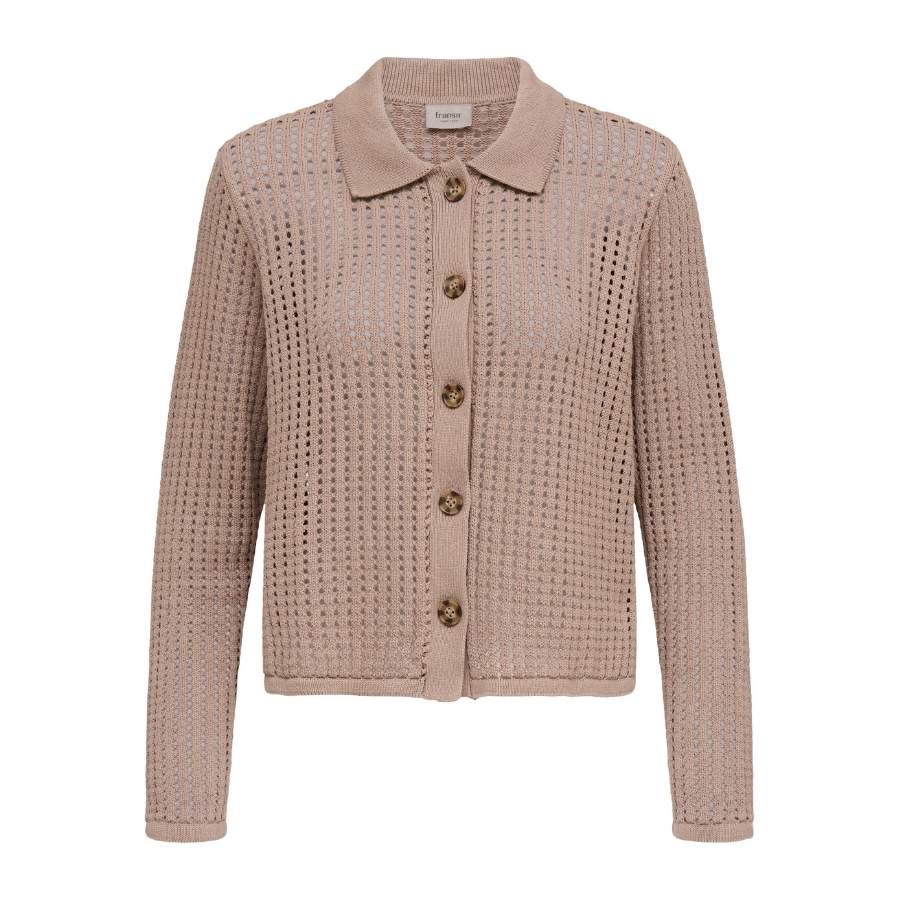 Denne elegante cardigan fra Fransa er strikket i en blød og behagelig bomuldsblanding med et dekorativt hulmønster, der giver et let og eksklusivt udtryk. Den har klassisk krave og gennemgående knaplukning med flotte knapper foran, som understreger det tidløse design.