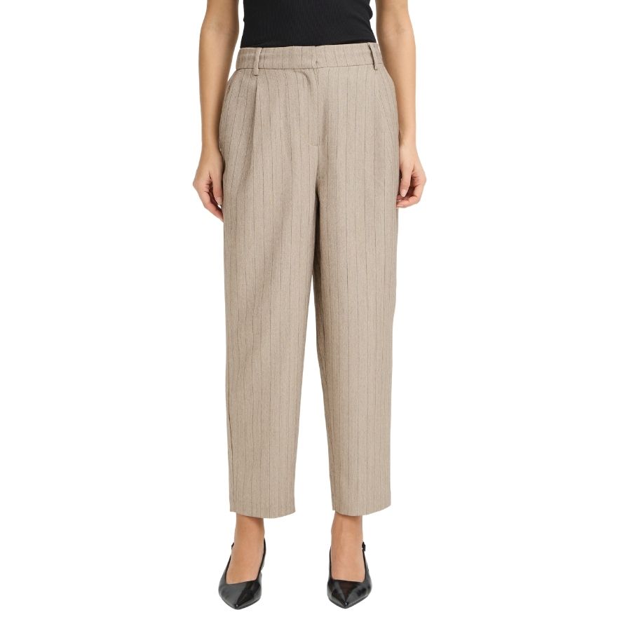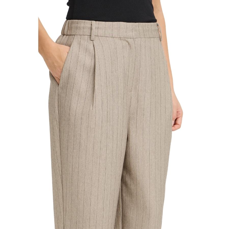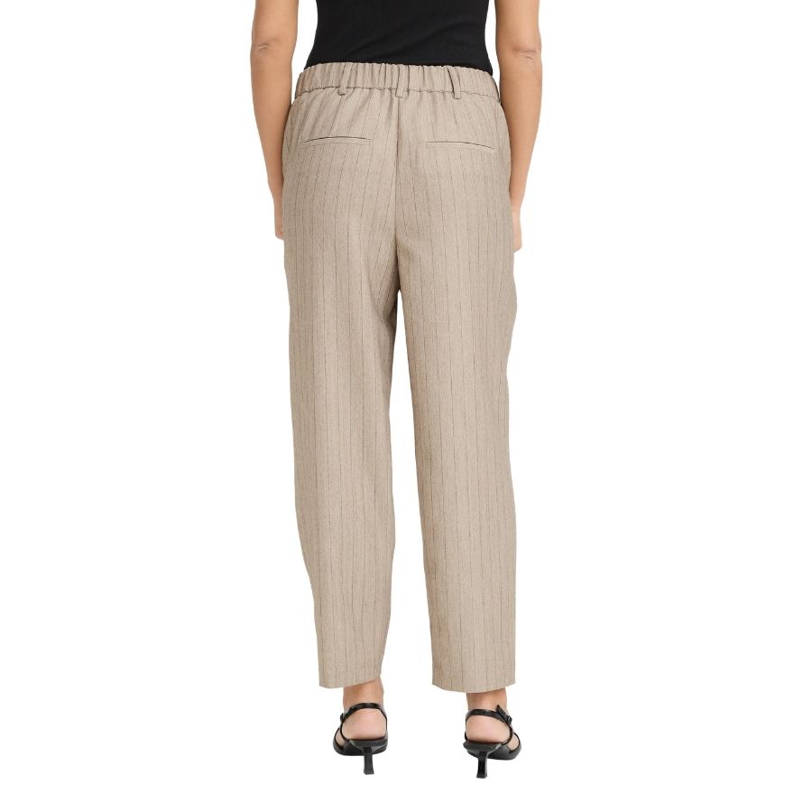 Elegante bukser fra Fransa i en smuk sandfarve med fine lodrette striber. Komfortabel pasform med stretch og et klassisk, stilrent udtryk.