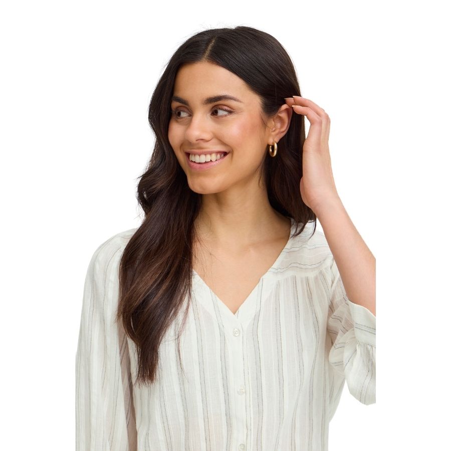 Let og feminin Fransa bluse i 100% bomuld med diskrete striber. Klassisk design med V-udskæring og 3/4-ærmer – perfekt til en lys og elegant garderobe.