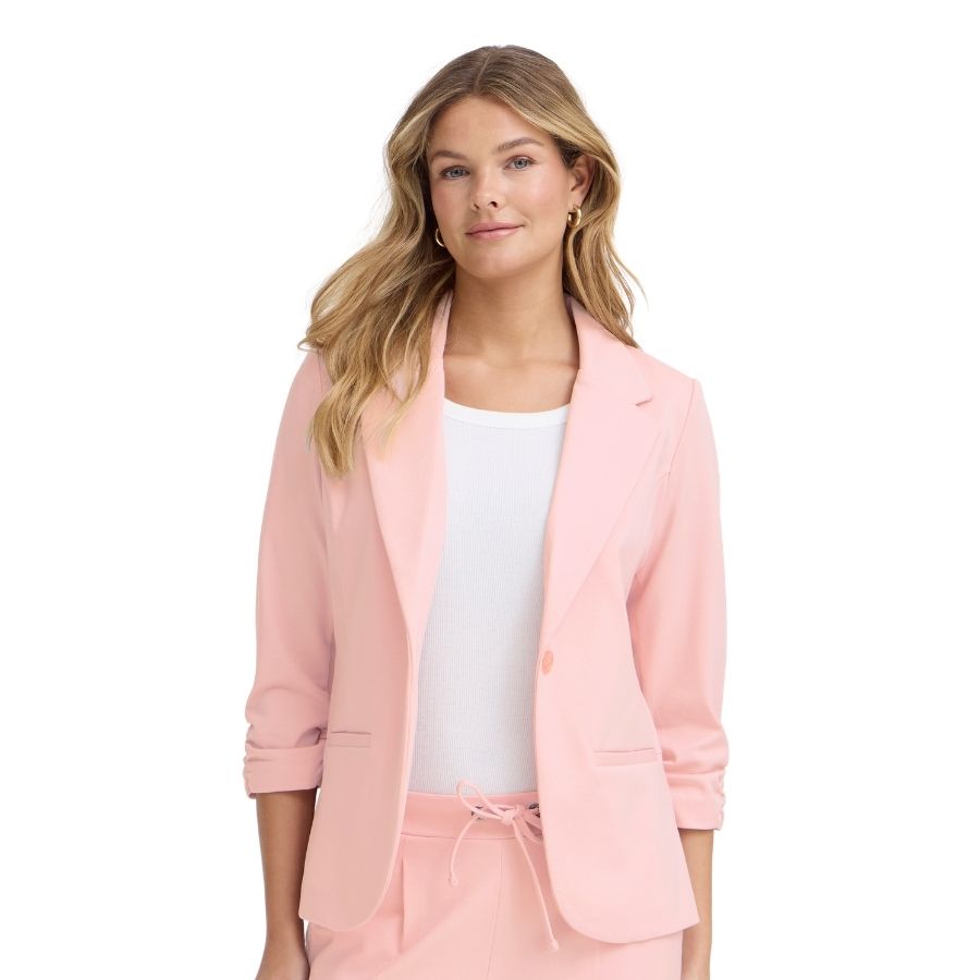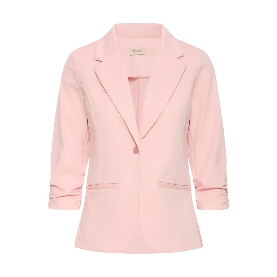 Elegant og feminin blazer fra Fransa i en smuk lys rosa farve. Blazeren har et klassisk snit med revers, én knap og let rynkede ærmer, som giver et moderne og afslappet look. Perfekt til både hverdag og fest.