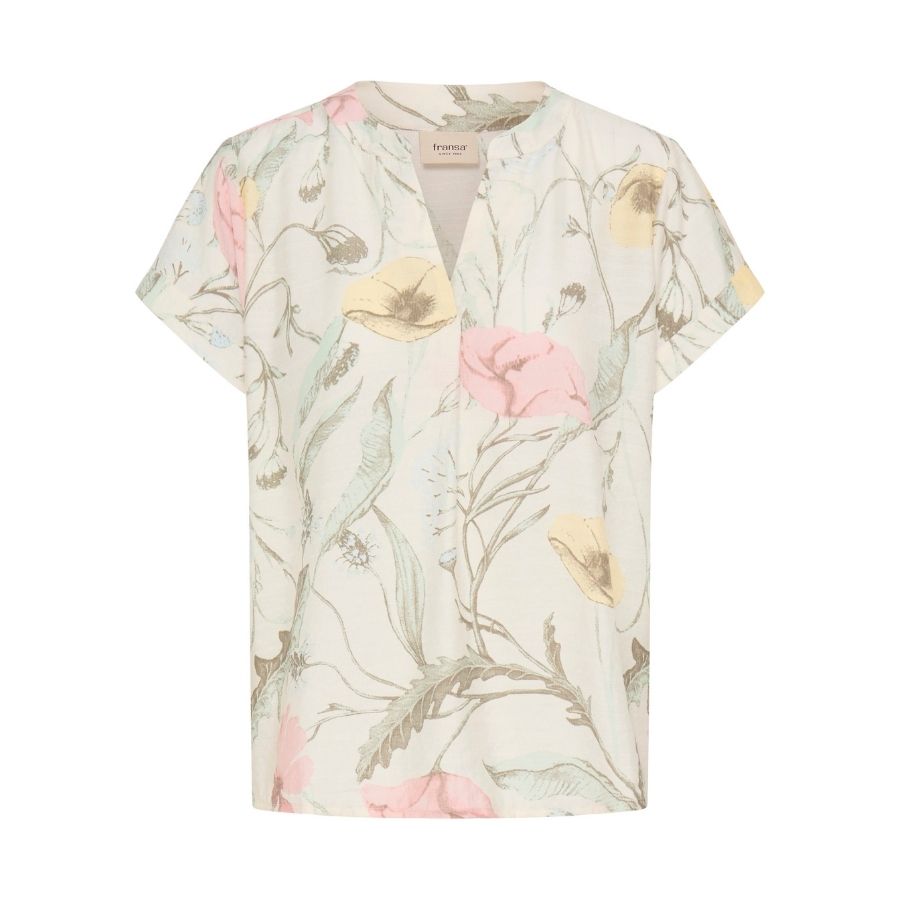 Denne fine bluse fra Fransa emmer af lethed og feminin stil. Det smukke blomsterprint i afdæmpede nuancer giver et elegant og roligt udtryk, som passer perfekt ind i sæsonens garderobe. Blusen har en løs og behagelig pasform samt en flot V-udskæring, der giver et let og luftigt look. Stoffet falder blødt og gør den ideel til både hverdag og lidt pænere brug. En skøn bluse, du nemt kan style igen og igen.