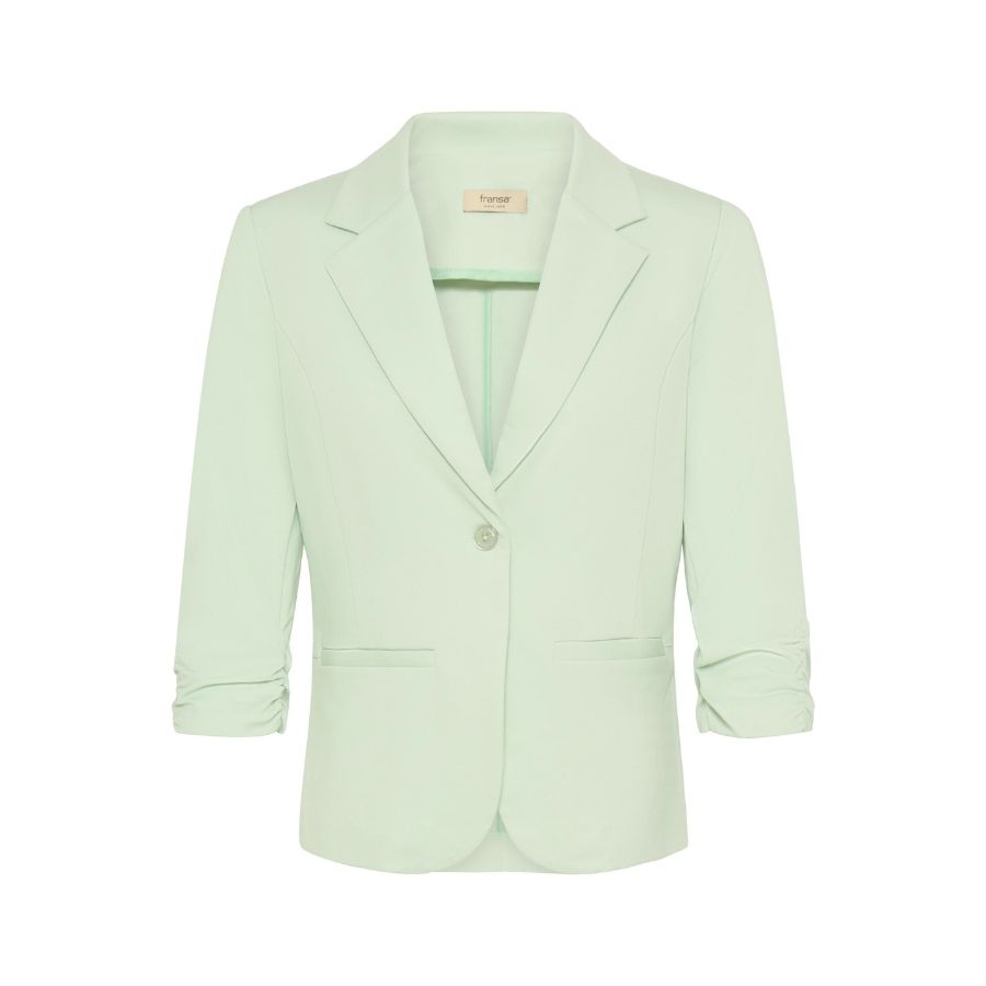 Denne elegante blazer fra Fransa er et sikkert valg til garderoben, når du ønsker et stilrent og feminint look. Den fine lysegrønne farve giver et frisk pust til dit outfit, samtidig med at snittet holder det klassisk og anvendeligt. Blazeren har en flot pasform med let taljering, 3/4 ærmer med diskret rynk og en enkel knaplukning foran. Perfekt både til kontor, hverdag og festlige anledninger – style den med jeans for et afslappet look eller over en kjole for et mere elegant udtryk.