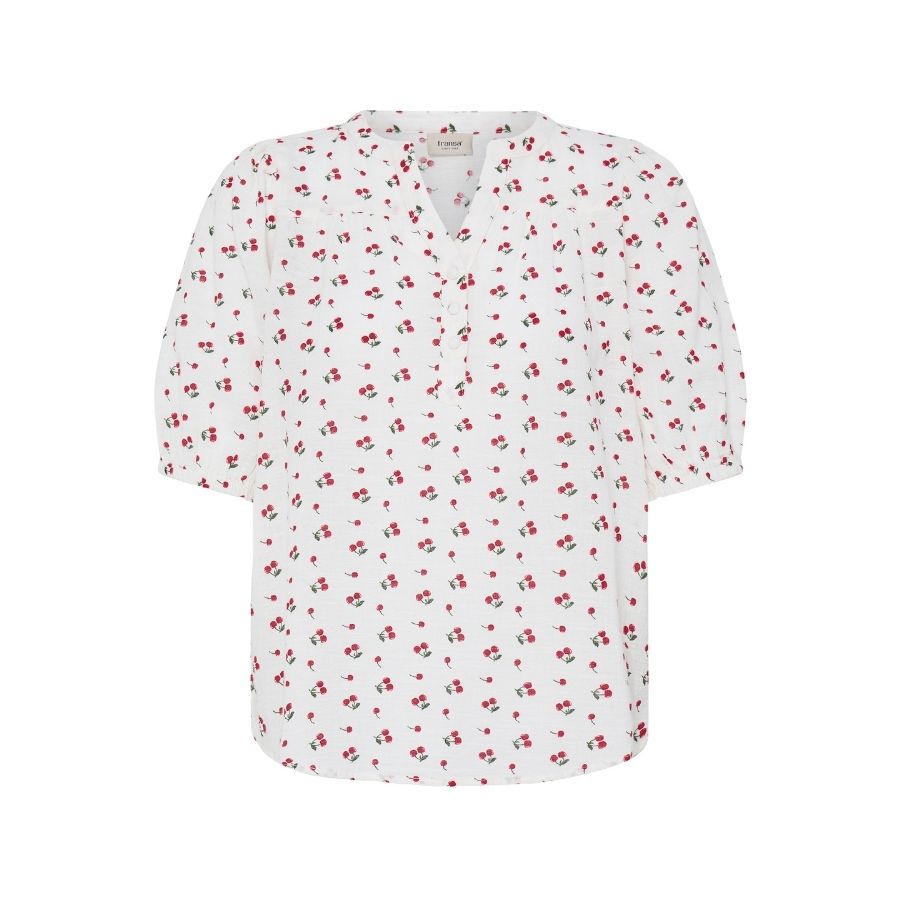 Let og feminin Fransa bluse i bomuld og hør med små røde blomster på lys bund.