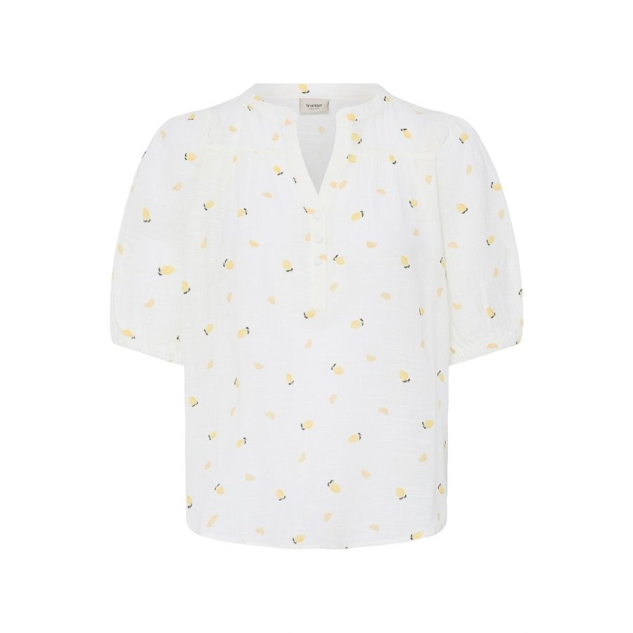 Skøn og frisk bluse fra Fransa med et fint og sommerligt citronprint på lys bund. Blusen er lavet i en let kvalitet med 90% bomuld og 10% hør, som gør den både åndbar og behagelig – perfekt til de varme dage. Den har en elegant stolpelukning foran og korte ærmer, der giver et afslappet, men stadig feminint udtryk. En nem bluse, der hurtigt bliver en favorit i sommergarderoben.
