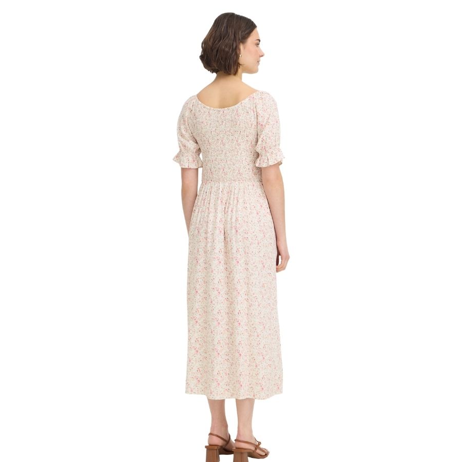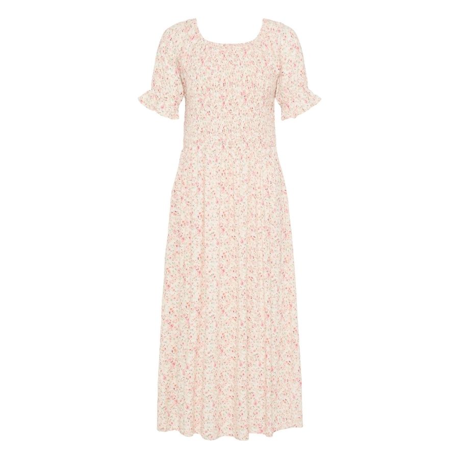 Denne smukke kjole fra Fransa er indbegrebet af let sommerstemning. Den er lavet i 100% viskose, som falder blødt og behageligt på kroppen. Kjolen har en flot smock-detalje over brystet, der giver en feminin pasform og god komfort. De korte ærmer med let flæse og det fine småblomstrede print i lyse og rosa nuancer skaber et romantisk udtryk. Perfekt til både hverdag, ferier og sommerens hyggelige arrangementer.